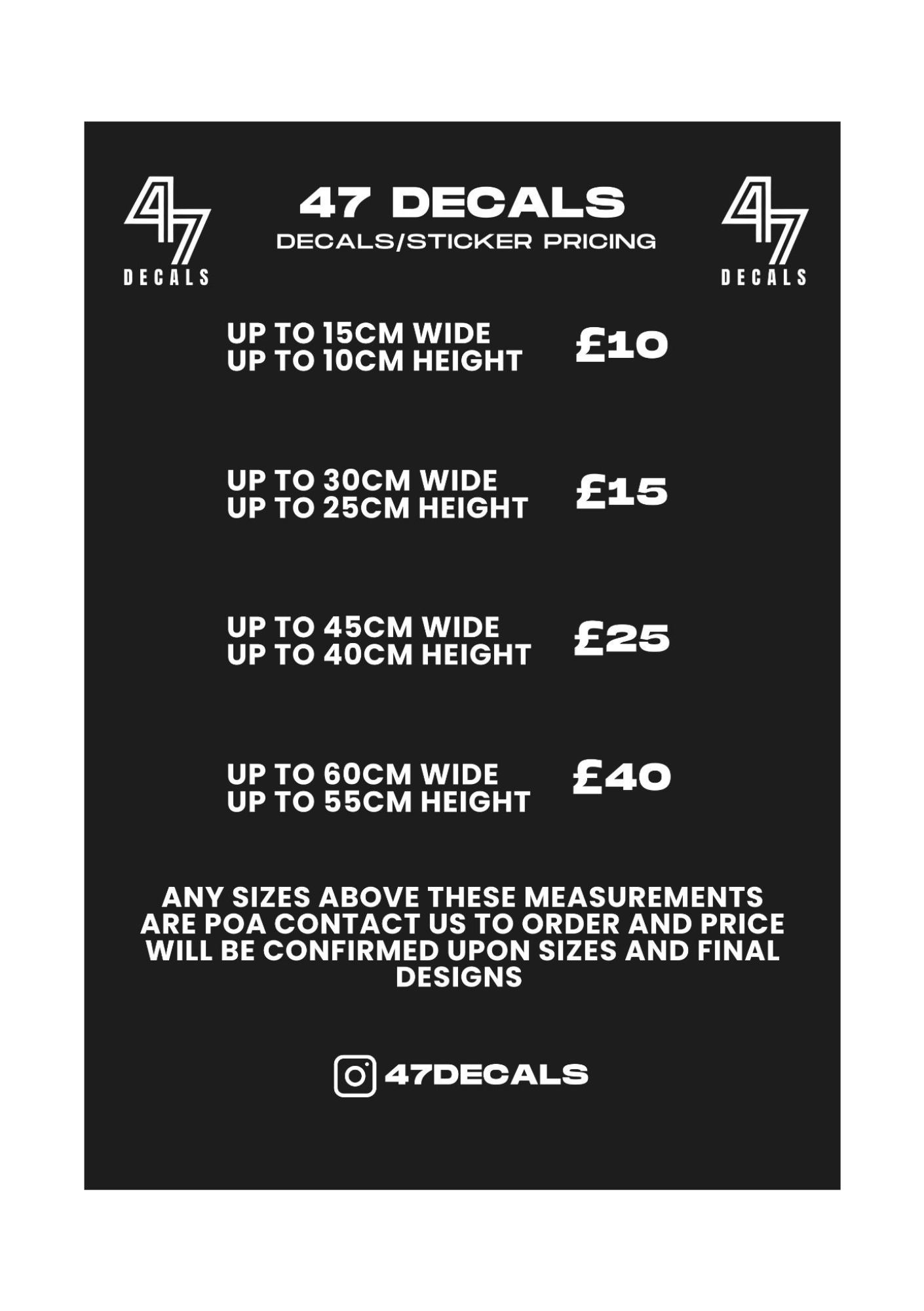 Looking for high-quality, custom decals? 47 Decals offers premium stickers in a range of sizes to suit your needs. Whether for vehicles, business branding, or personal projects, we provide durable and stylish decals at competitive prices.